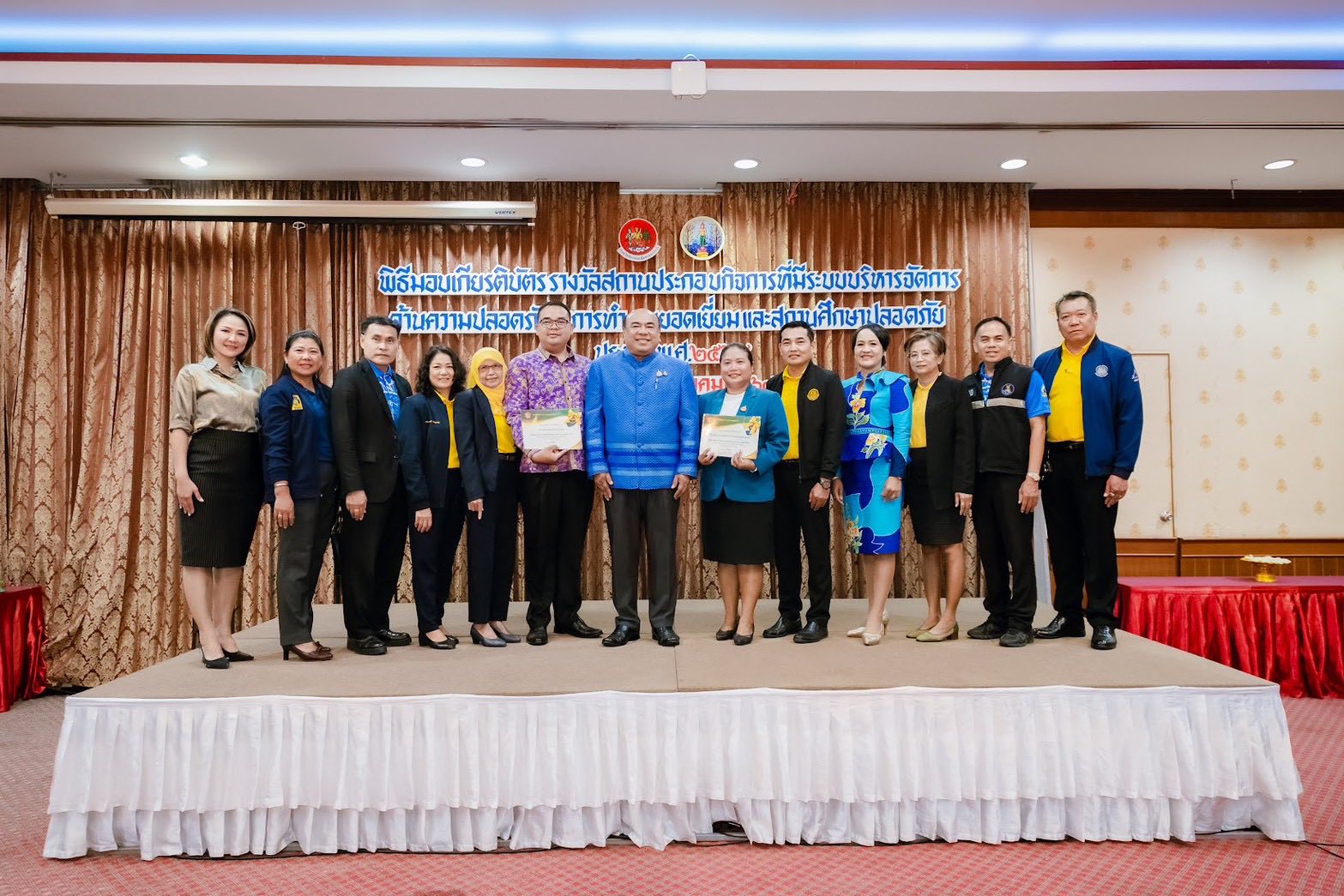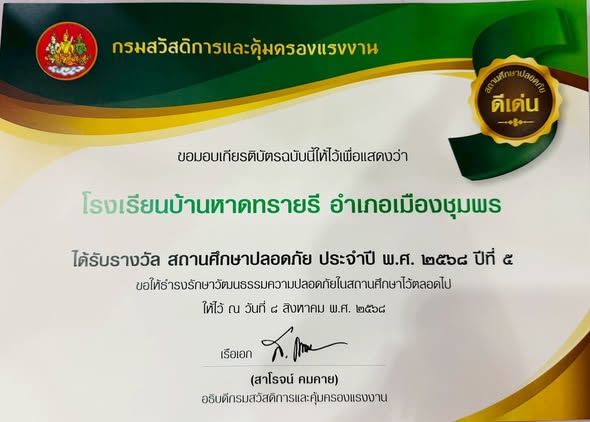 | วันที่ 22 ตุลาคม 2568 นางสาวนวลจันทร์ พุ่มพวง ผู้อำนวยการโรงเรียนบ้านหาดทรายรี เข้าร่วมรับเกียรติบัตรรางวัลสถานศึกษาปลอดภัย ประจำปี2568 ณ ห้องประชุมไข่มุกไพลิน ชั้น 1 โรงแรมชุมพรการ์เดนส์ื ตำบลท่าตะเภา อำเภอเมืองชุมพร จังหวัดชุมพร โดยมีรองผู้ว่าการจังหวัดชุมพรเป็นประธานมอบรางวัล |