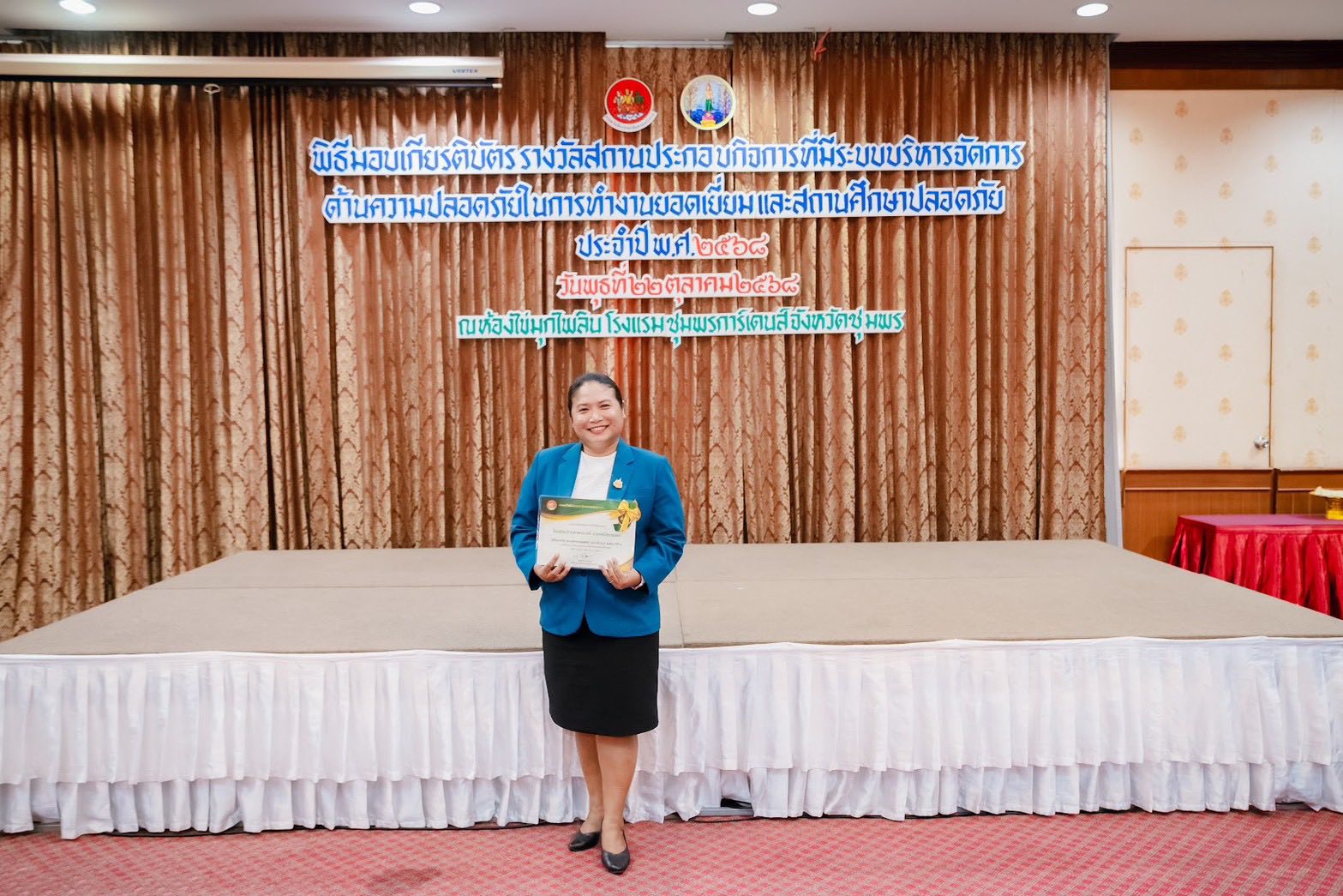 วันที่ 22 ตุลาคม 2568 นางสาวนวลจันทร์ พุ่มพวง ผู้อำนวยการโรงเรียนบ้านหาดทรายรี เข้าร่วมรับเกียรติบัตรรางวัลสถานศึกษาปลอดภัย ประจำปี2568 ณ ห้องประชุมไข่มุกไพลิน ชั้น 1 โรงแรมชุมพรการ์เดนส์ื ตำบลท่าตะเภา อำเภอเมืองชุมพร จังหวัดชุมพร โดยมีรองผู้ว่าการจังหวัด