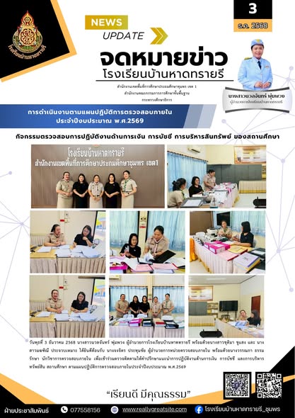 | วันพุธที่ 3 ธันวาคม 2568 นางสาวนวลจันทร์ พุ่มพวง ผู้อำนวยการโรงเรียนบ้านหาดทรายรี พร้อมด้วยนางสาวชุติมา ชูแสง และ นางสาวมฆฑิณี ประจวบเหมาะ ต้อนรับ นางจงจิตร ประทุมชัย ผู้อำนวยการหน่วยตรวจสอบภายใน พร้อมด้วยนางวรรณภา ธรรมรักษา นักวิชาการตรวจสอบภายใน เพื่อเข้าร่วมตรวจติดตามให้คำปรึกษาแนะนำการปฏิบัติงานด้านการเงิน การบัญชี และการบริหารทรัพย์สิน สถานศึกษา ตามแผนปฏิบัติการตรวจสอบภายในประจำปีงบประมาณ พ.ศ.2569 |