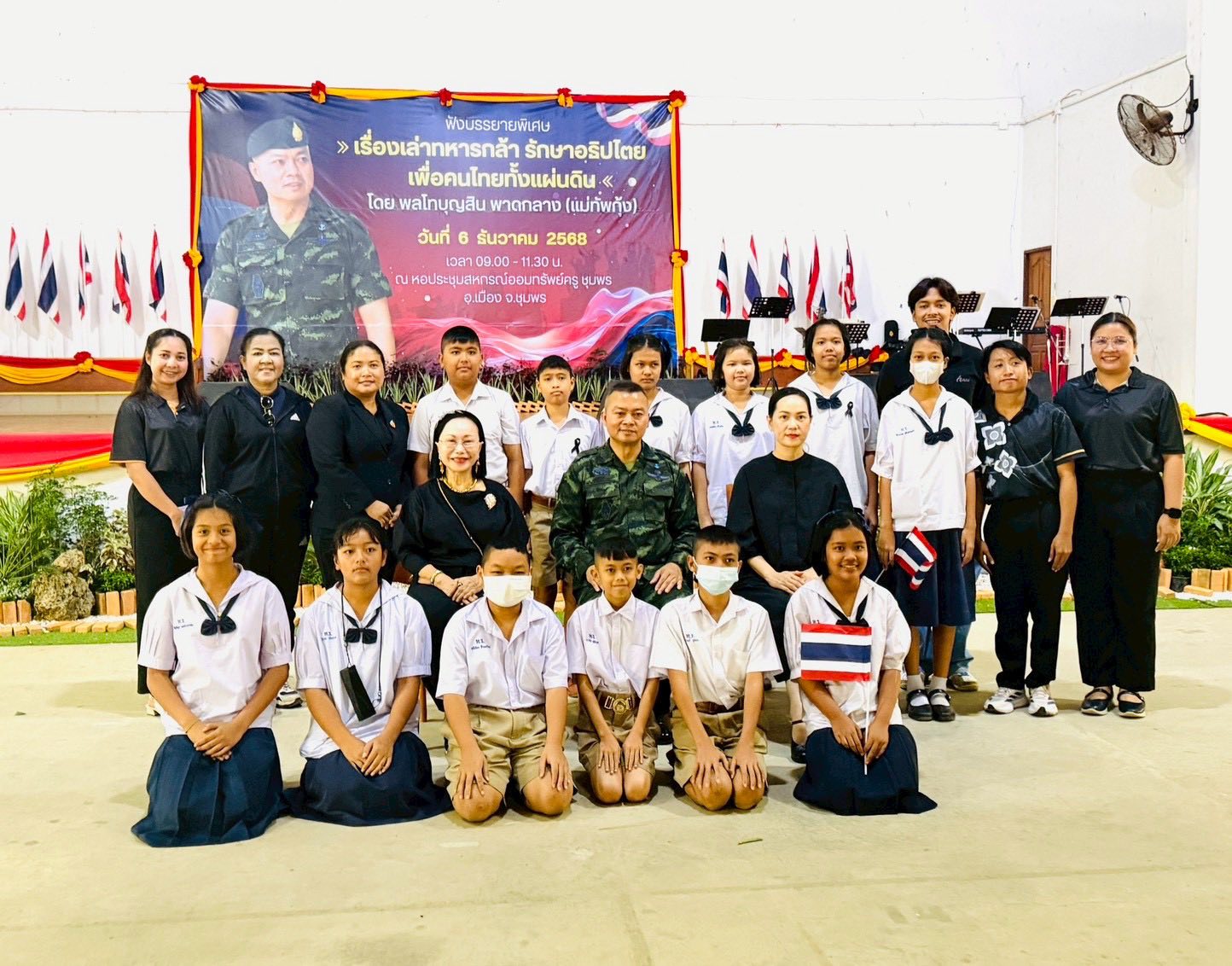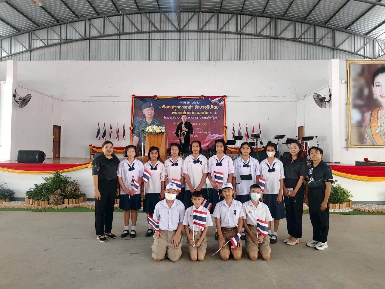 วันเสาร์ที่ 6 ธันวาคม 2568 นางสาวนวลจันทร์ พุ่มพวง ผู้อำนวยการโรงเรียนบ้านหาดทรายรี พร้อมด้วยคณะครูโรงเรียนบ้านหาดทรายรี ได้นำนักเรียนชั้นประถมศึกษาปีที่ 6 เข้าร่วมฟังบรรยายพิเศษ “เรื่องเล่าทหารกล้า รักษาอธิปไตย เพื่อคนไทยทั้งแผ่นดิน” โดย พลโทบุญสิน พาดกล