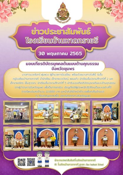นางสาวนวลจันทร์ พุ่มพวง ผู้อำนวยการโรงเรียน พร้อมด้วยนางสาวรังสินี ร่มรื่น ครูโรงเรียนบ้านหาดทรายรี นำนักเรียน เด็กชายบวรวิชญ์ ผอมแก้ว นักเรียนชั้นประถมศึกษาปีที่ 2 และเด็กชายอดิศร เย็นสุวรรณ นักเรียนชั้นประถมศึกษาปีที่ 5 เข้ารับมอบเกียรติบัตรบุคคลต้นแบบด้านคุณธรรม จากผู้ว่าราชการจังหวัดชุมพร เพื่อเป็นการยกย่อง เชิดชูเกียรติผู้ประพฤติปฏิบัติตนเป็นแบบอย่างที่ดี #กรณีพบเงินสดจำนวน22,000บาทและนำส่งเจ้าหน้าที่ตำรวจเพื่อส่งคืนเจ้าของ