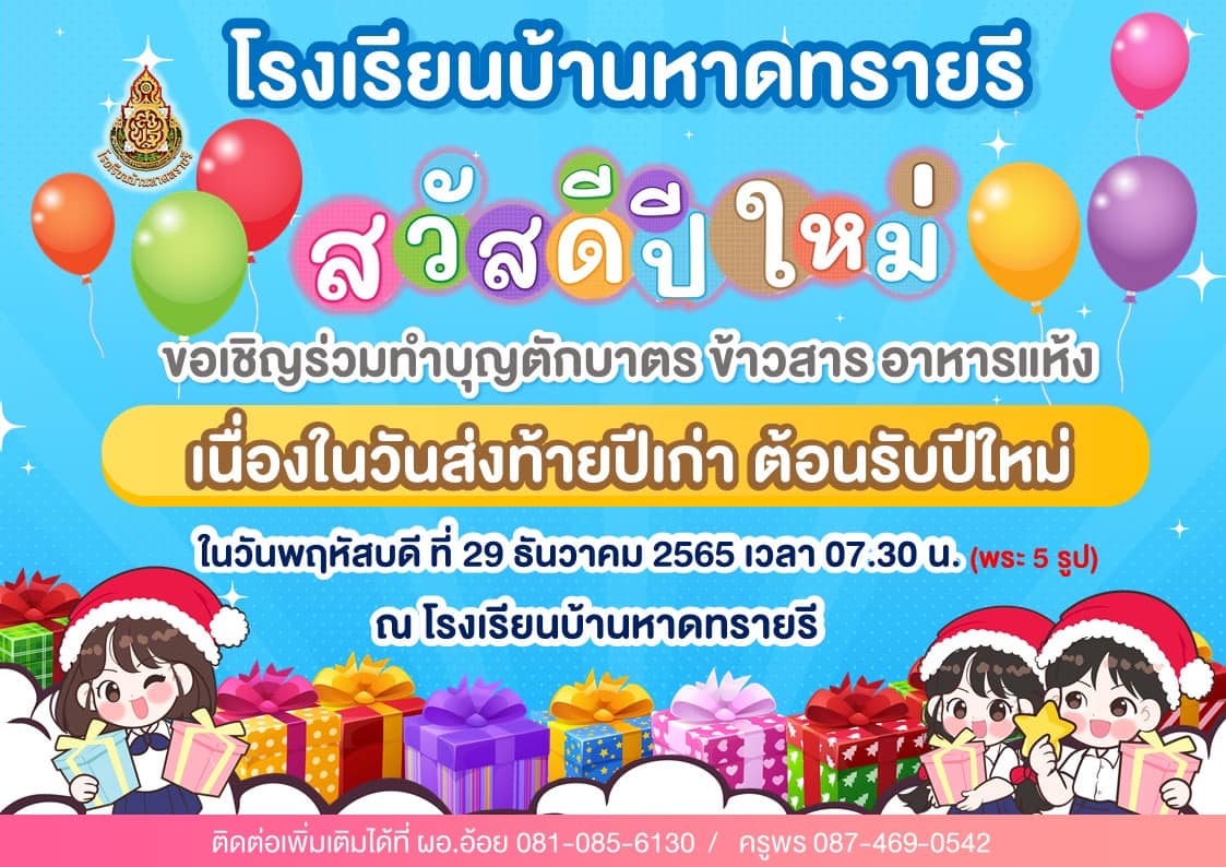 ขอเชิญชวนทุกท่านร่วมทำบุญตักบาตร ข้าวสาร อาหารแห้ง เนื่องในวันส่งท้ายปีเก่า ต้อนรับปีใหม่ ณ โรงเรียนบ้านหาดทรายรี