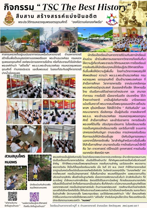 | นักเรียนและตัวแทนสภานักเรียนโรงเรียนบ้านหาดทรายรี ร่วมกับ การขับเคลื่อนข้อคิดเห็น การรู้จักประวัติศาสตร์ในท้องถิ่นของตนเอง กิจกรรม “ TSC The Best History ” สืบสาน สร้างสรรค์ พระประวัติกรมหลวงชุมพรเขตรอุดมศักดิ์ ในประวัติความเป็นมาท้องถิ่นของเรา ณ ศาลกรมหลวงชุมพร #TSC The Best History |